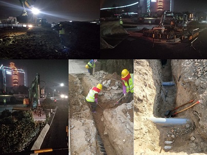 夜里,家人們忙著溝槽土方開挖外運(yùn),并齊心協(xié)力拆除黑龍江路路口導(dǎo)流島及路緣石。春夜雖然料峭,家人們的拼勁卻溫暖了夜空。燈火闌珊,機(jī)器轟鳴,催人奮進(jìn)。白天,項(xiàng)目部管理人員則組織勞務(wù)開展挖溝槽工作,并協(xié)助甲方進(jìn)行承臺(tái)探坑開挖,進(jìn)展喜人。