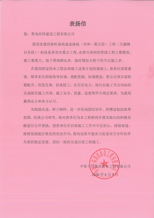 付出總有回報(bào),用心贏得尊重。市政三部的家人們用自己的行動(dòng)和奮斗贏得了中鐵十局集團(tuán)青島工程有限公司的高度認(rèn)可,并收到了一封來自中鐵十局集團(tuán)青島工程有限公司的表揚(yáng)信,既高度肯定了公司的整體水平和能力,又勉勵(lì)我公司不忘初心,持續(xù)奮進(jìn),保持能打勝仗的優(yōu)良作風(fēng),一往直前,取得最終施工任務(wù)的圓滿結(jié)束。